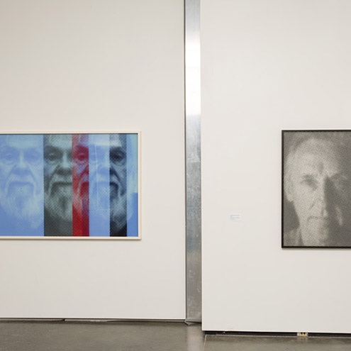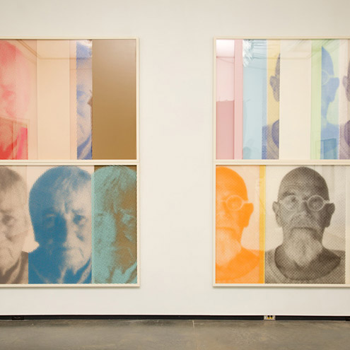 The exhibition features a major work, Untitled (Bill), recently gifted to AEIVA’s permanent collection. This potent diptych features two subtle yet powerful portraits of seminal video artist Bill Viola. Comprised of glowing blue and green nail polish dots, the double portraits are tonally reversed and mirror images of each other — ghost-like emanations that seek to capture both the likeness as well as the soul of this enigmatic artist.