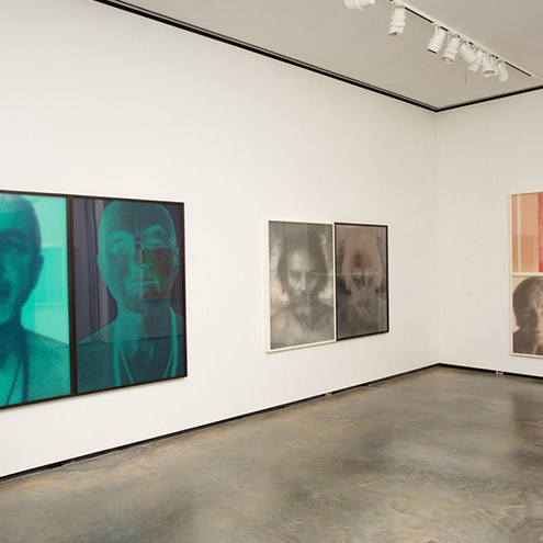 Paul Rusconi: Emanations is comprised of paintings of artists who have transformed their fields. Subjects include Ed Ruscha, John Baldessari, Agnes Martin, and Chuck Close. Rusconi’s investigation and interest in the portrait begins with his own photo-based images as well as found or sourced materials. This body of work is a process of hand applying nail polish onto Plexiglas. His concern with the portrait is not only the conveyance of likeness, but the subtlety of emotion and expression that is found somewhere between the light and shadow of one’s face. Closely observing the surface, one can see that his works are comprised of patterns that recall the Benday dots of Roy Lichtenstein. Unlike Lichtenstein’s use of the Benday dot, which is uniform in size, Rusconi uses different sized dots to create the illusion of convex and concave shapes on a two-dimensional surface.