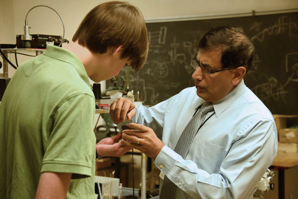 Yogesh Vohra, Ph.D., working with physics graduate student Chris Perreault.Nine Alabama universities and one private firm are partnered in a new $20 million, five-year effort led by the University of Alabama in Huntsville (UAH) to develop transformative technologies in plasma science and engineering (PSE) funded by the National Science Foundation (NSF) Established Program to Stimulate Competitive Research (EPSCoR).