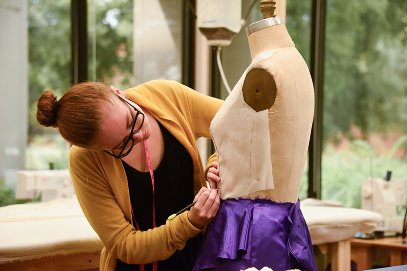 The costume studio is fully equipped with domestic and industrial sewing machines and sergers, industrial irons, four large cutting tables, dress forms, rolling racks and a curtained off fitting area.