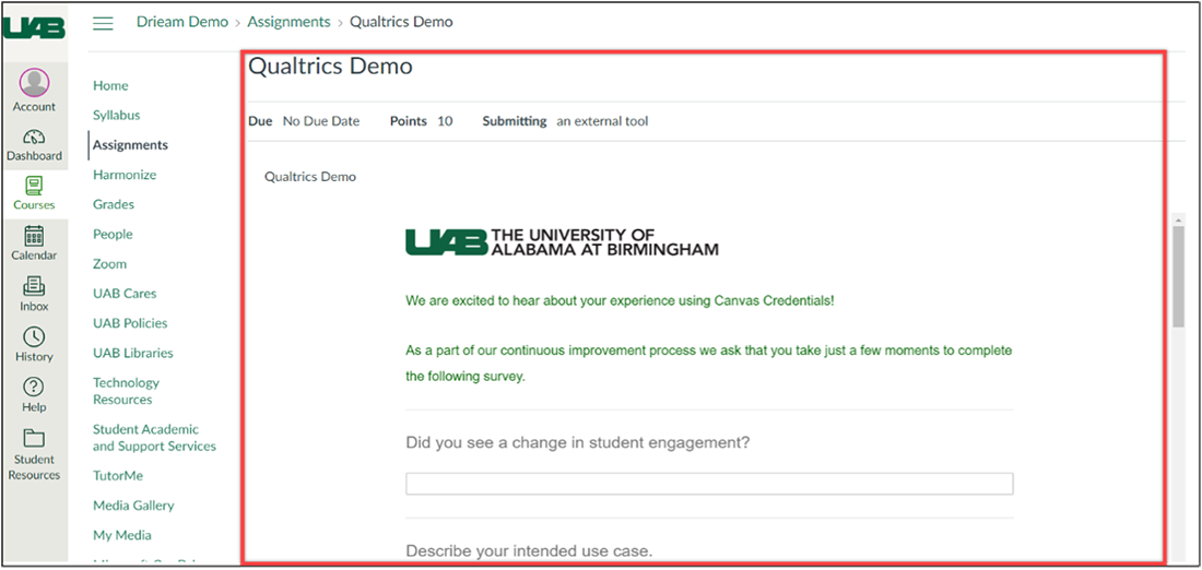 Once you are in your desired course, open the assignment and you will see the Qualtrics survey on the assignment page.