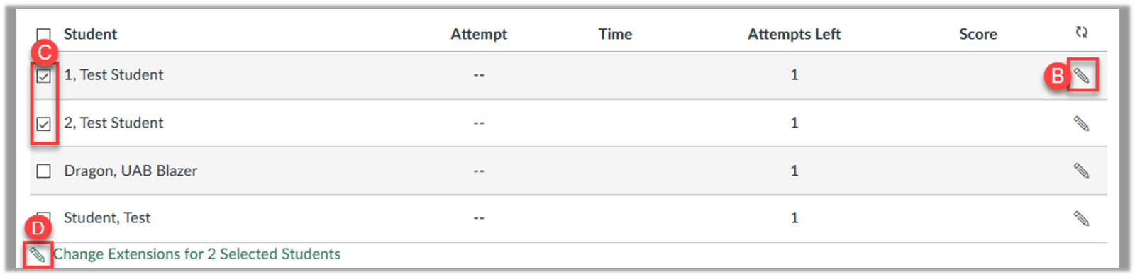 - Click the Pencil icon (B) beside the desired student to moderate their quiz. Instructors can also check multiple students (C) and click the Pencil edit icon (D) at the bottom to make changes to all selected students.