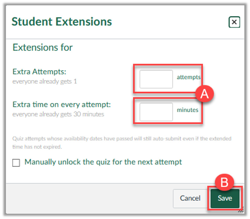 - Quiz availability dates still apply when adding extra time or attempts. If the Until date passes when students are taking the quiz with extended time, the quiz will auto-submit even if the student's time extension has not expired.