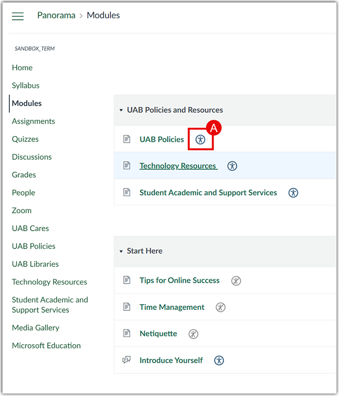 In your Canvas course, select the Alt Formats icon (A) next to a file or page to open a list of available formats.