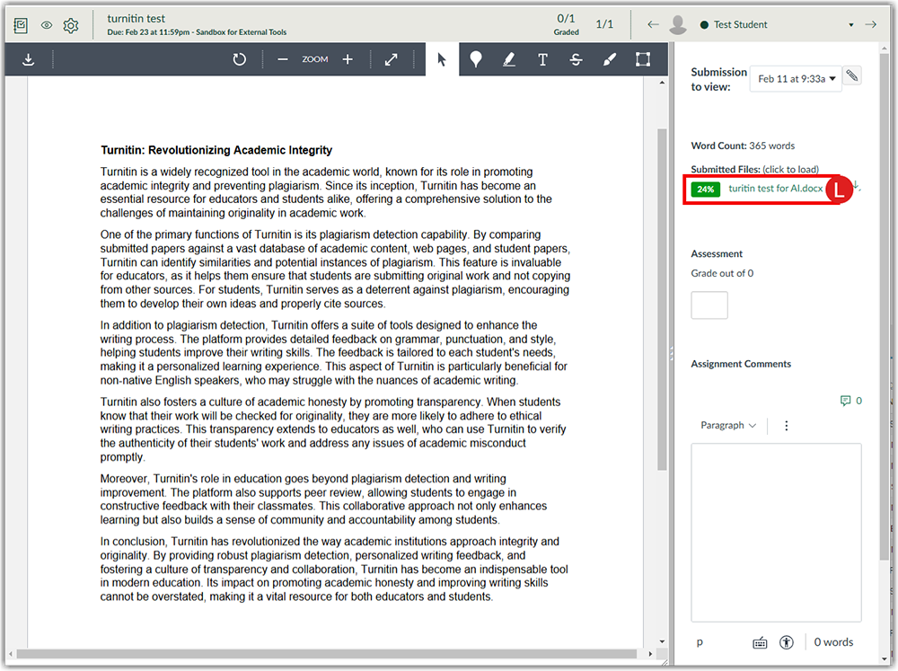 - Click on the Speed Grader (K) to check submitted assignments and Turnitin reports.