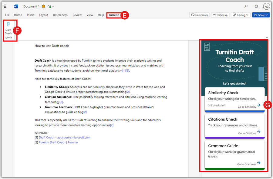 - Draft coach allows three similarity checks per document. The overall similarity is generated, and sources are listed under Similarity tab (H).