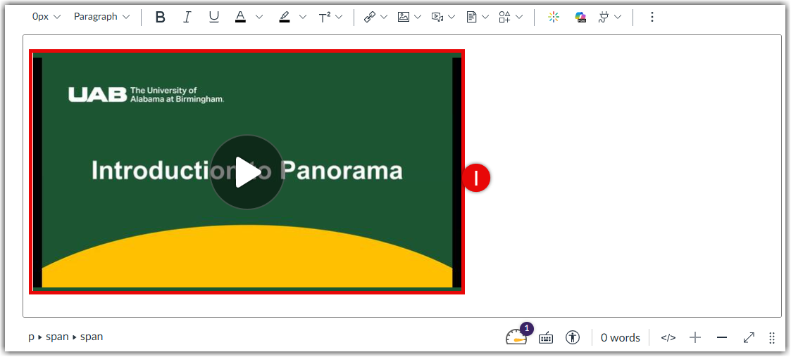 - The window will disappear and bring you back to the Rich Content Editor text box. You will now have the media embedded (I) inside the text box. Other items such as text, images, and files can be added to the text area. When all items and details have been filled out, click Save (J) at the bottom.
