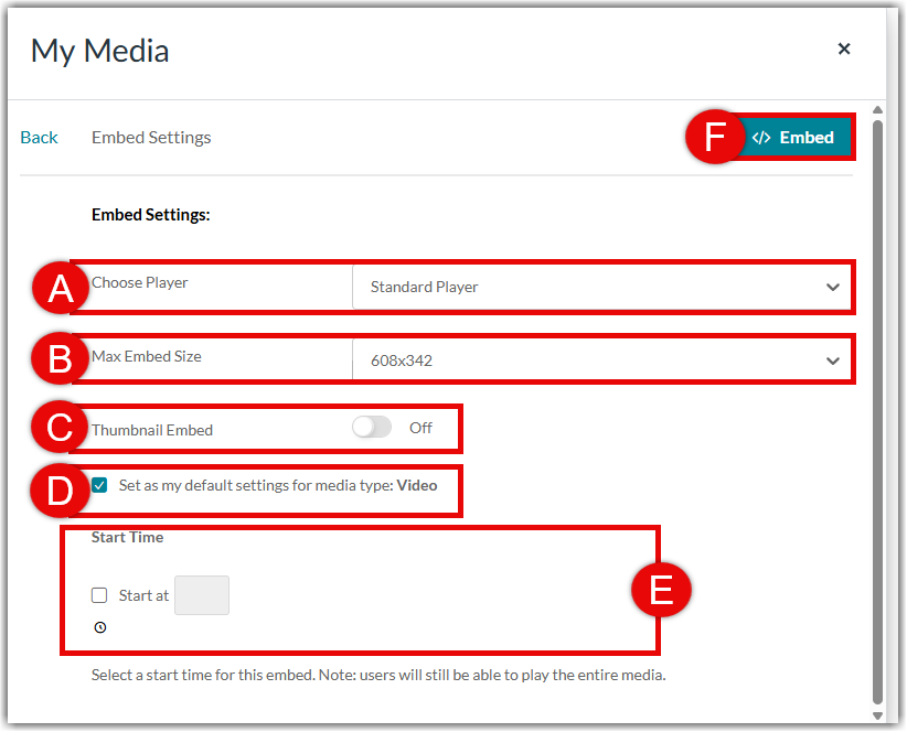 - Click the Set as Default Settings (F) checkbox if desired. Use this check box to make these settings your new default. Once set for a media type, you will not need to enter the embed settings again for this type of media. You can simply click embed.