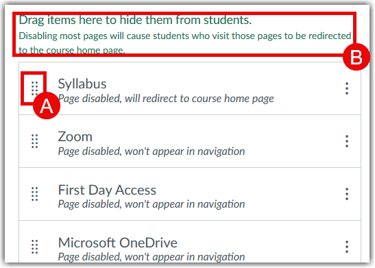 - Click the vertical, parallel sequence of dots next to Simple Syllabus (A), and drag the rectangle to the top column of items located under the text Drag and drop items to reorder them in the course navigation (B).