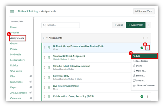 - Click the three-dot kebab (B) by the assignment name. then Edit (C).