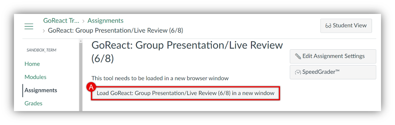 - The GoReact assignment will now load in your current tab if the URL was correctly entered. Click Load [your assignment’s name] in a new window (A) to verify that the URL was edited correctly. If this window does not appear, start at step one and verify that the edited External Tool url is correct.