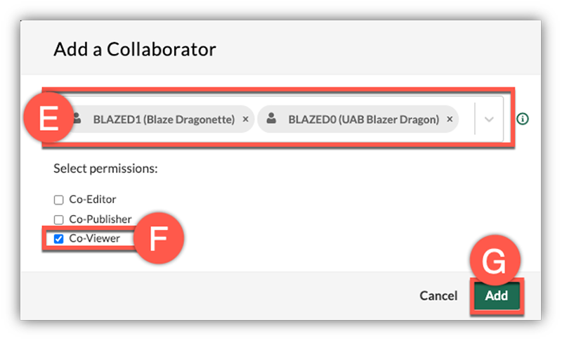 - Select the box beside Co-Viewer (F) and click Add (G) to add collaborators to Kaltura video.