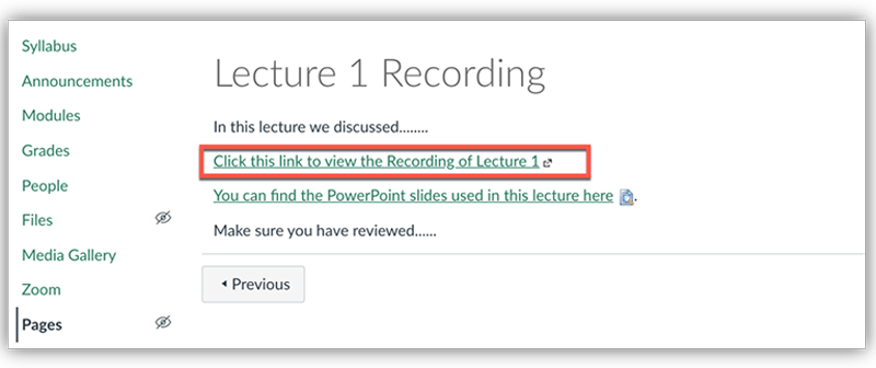 Once you have the link used for sharing, you can place that link in Canvas in various ways. Click through the options below to see the different ways you can provide the link to your students.