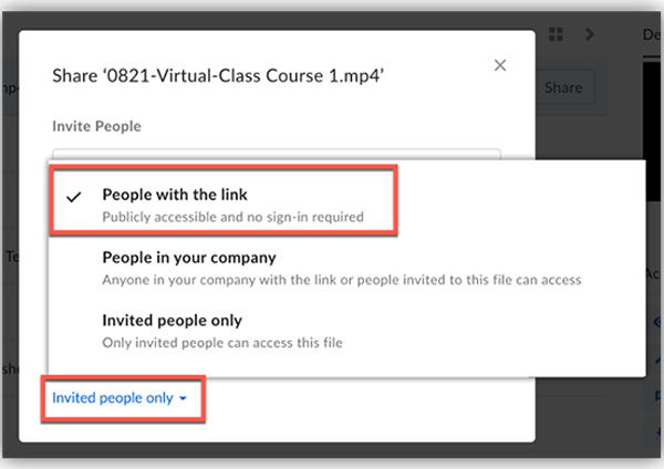 - Click the blue text Invited people only, and change the selection to people with the link so that it becomes a public link that can be accessed without you having to type everyone’s email addresses in.