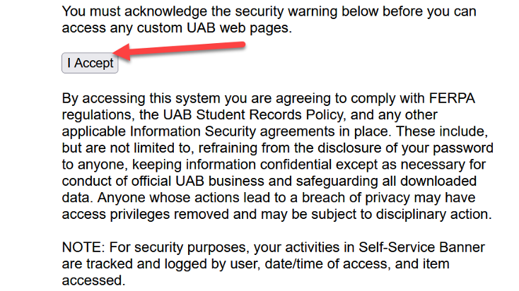 - If the security warning message appears (see screenshot below), click “I Accept” to comply with the terms.