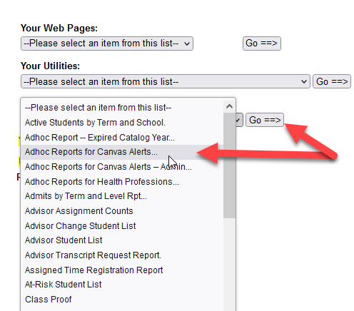- Under Your On-Line Reports, select “Adhoc Reports for Canvas Alerts…” and click on “Go==>.”