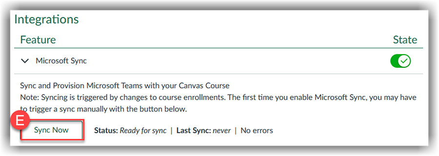 - Click Sync Now (E) to create a Microsoft Class Team for the course. The Team creation may take several minutes. The Status will change to Sync manually scheduled.