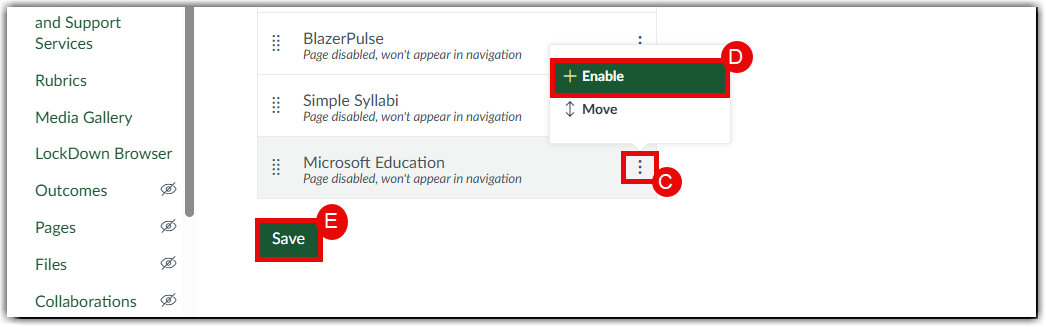 - In the Navigation (B) tab of your course, browse for Microsoft Education (C) and Enable (D) then Save (E) those Settings (B).