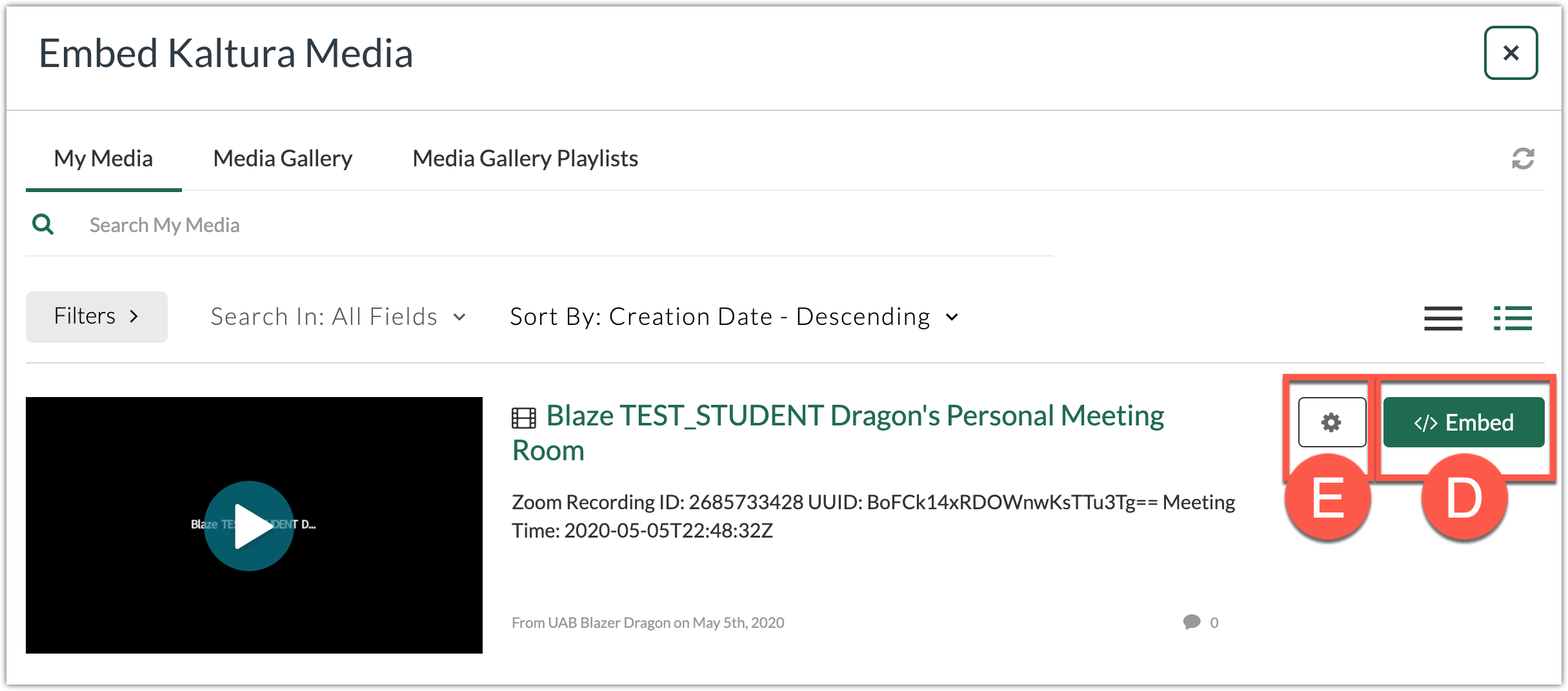 - Locate the desired Zoom meeting, and click Embed (D) or click the settings gear (E) for more embed options.