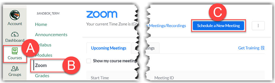 - Click Schedule a New Meeting (C) at the top right to schedule a Zoom meeting with the people in the course.