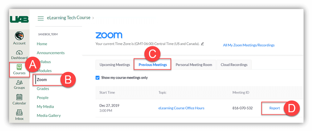 - To access Zoom in Canvas, click the desired Canvas Course (A), then click the Zoom (B) link in the course navigation. Use this Canvas guide to enable Zoom if you do not see it in your Course.