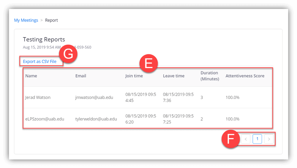 - The Attendance Report (E) includes a list of students that attended the Zoom meeting, their email address, join/leave time, duration of time in meeting, and attentiveness score.