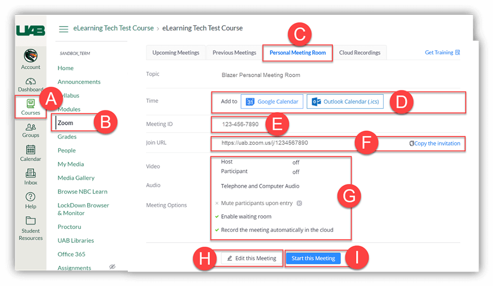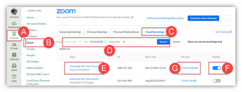 - Click All My Zoom Meetings/Recordings (E) to see all Zoom meetings including meetings scheduled outside of this course.