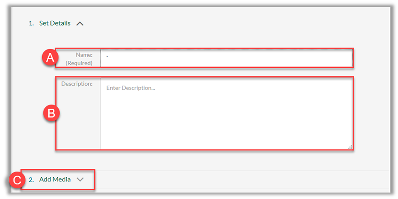 - Add a Name (A), Description (B), and selct Add Media (C) drop down menu to display your My Media gallery.