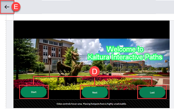 - After customizing the hotspots, click the back arrow (E) to return back to the video paths.