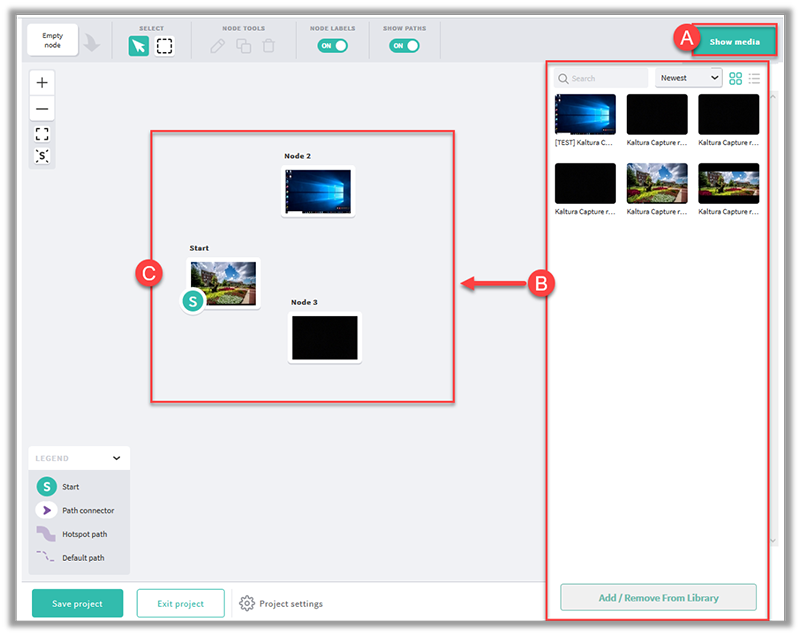 - To add an additional video node to the interactive path, drag and drop the Empty node (A) to the video composer.