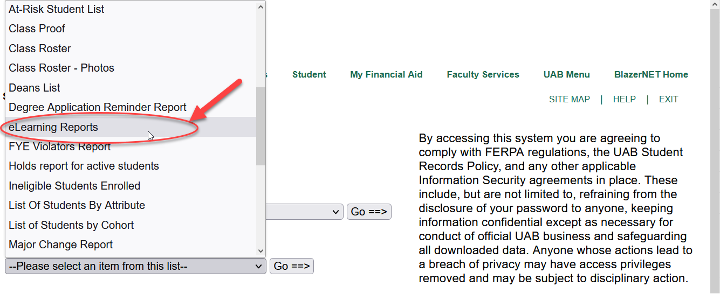 - Navigate to “Your On-Line Reports” and select “eLearning Reports” from the dropdown menu.