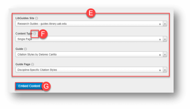 6. Click Embed Content (G).