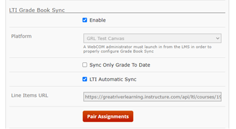Once the grade book is paired to Canvas, it will create an area in the grade book that allows the pairing of Gradebook items in Great River Learning to those Gradebook items sent from Canvas. This function does away with needing to go into each grading element and select the LTI line item from Canvas.