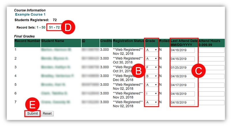 - Be sure to Review/Revise every Page (D) then click Submit (E) to submit final grades to Banner.