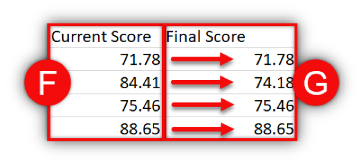 - Export Gradebook and see that the Current Score (F) column matches the Final Score (G) column. If these columns do not match refer back to step 2 to see if there are any muted assignments, ungraded assignments, or dashes.