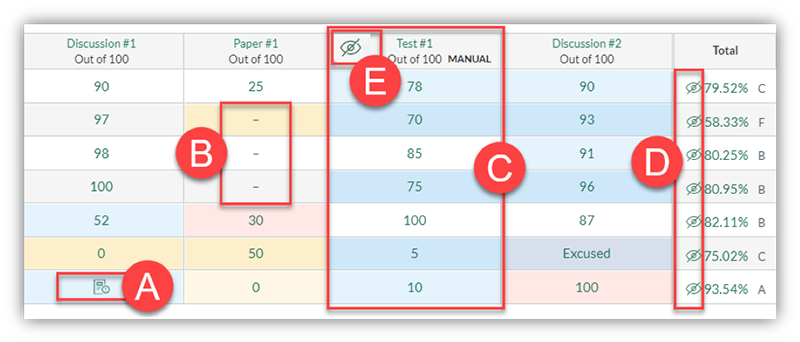 NOTE: An Eye with a Cancel line (D) through it will display in the total column if there are any grades that have not been posted. An Eye with a Cancel line (E) icon will also display at the top column of any assignments that have grades that need to be posted. Use this guide to post grades.