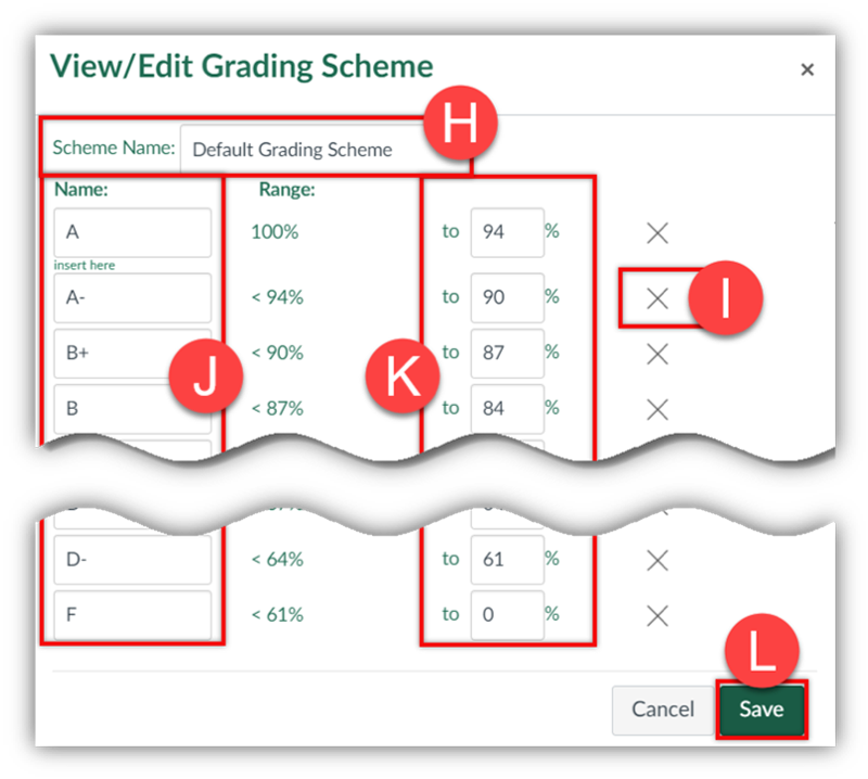 - Edit the Letters (J) in the left column to match your course or program grading scheme. This should be the same as the grading scheme in your course syllabus.