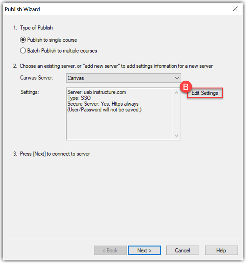 - The Publish Wizard should have the correct settings for the UAB Canvas server already in place. Select Next (M). Note: If the correct settings are not in place, see the Respondus Connection Guide.