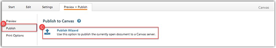 - In the Preview + Publish tab select Publish (K) then Publish Wizard (L).