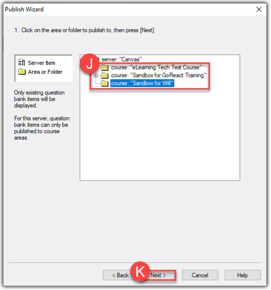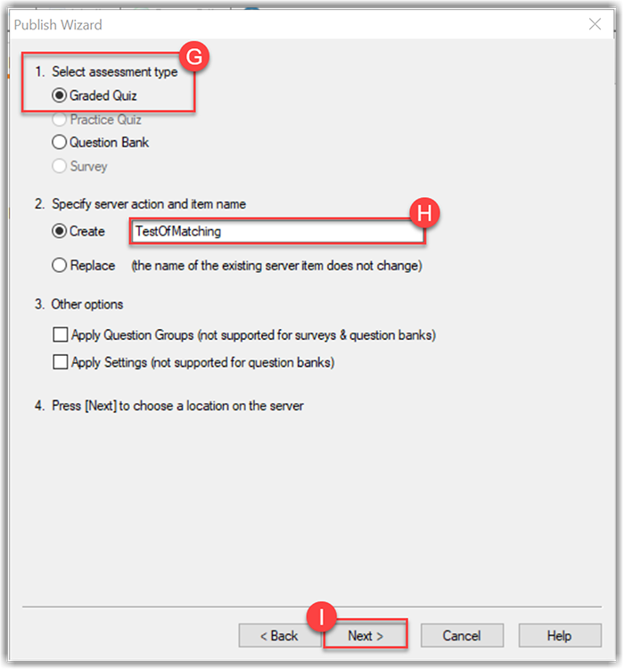 - Under Specify server action and item name by Create (H), enter a new name or accept the Question Bank name that Canvas will use for your file. When satisfied, Next (I).