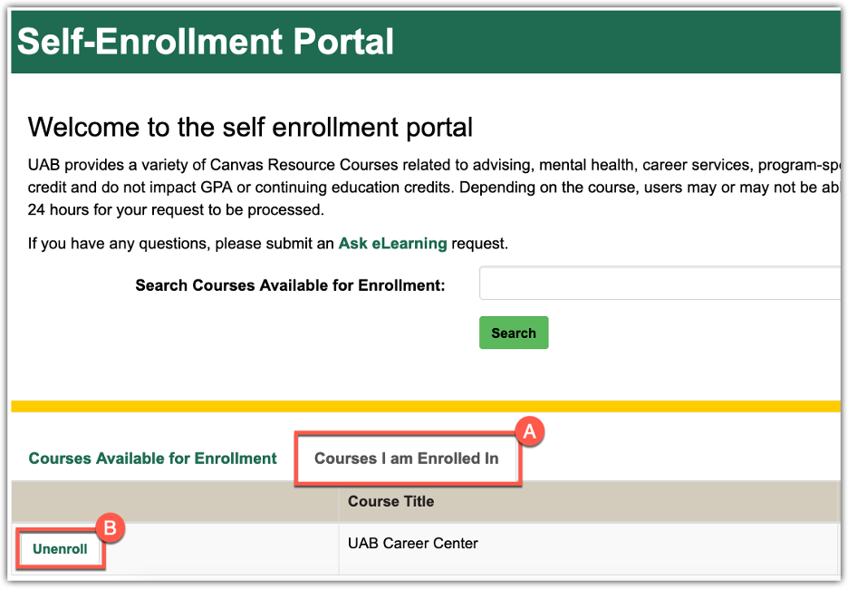 - To remove yourself from a self-enroll/unenroll course, select Courses I am Enrolled In (A) to show the non-credit resource self-enroll/unenroll courses you are currently enrolled in. Click Unenroll (B) next to the course name. The page will switch back to the list of courses available for enrollment. To verify that the enrollment has been removed, select Courses I am Enrolled In (A). The course should no longer be on the list.