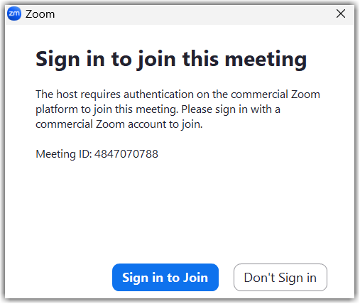 If a participant tries to join the meeting or webinar and is not logged into Zoom, or logging in with the specified email domain, they will receive one of the following messages: