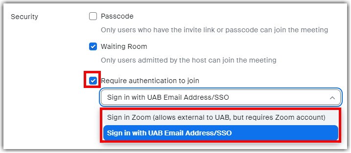 By default, anyone with the link can join meetings as a guest. You can force users to authenticate before being allowed to join your meeting. When scheduling a meeting, you can decide if it will require authentication and can limit it to users a with a Zoom account or users with a Zoom account at UAB.