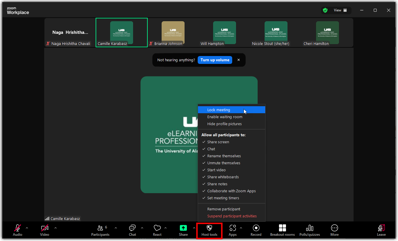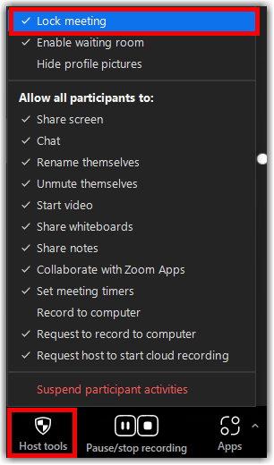 Alternatively, users can lock the meeting from the Security Icon. - Click the Host tools Icon icon on the Zoom toolbar.