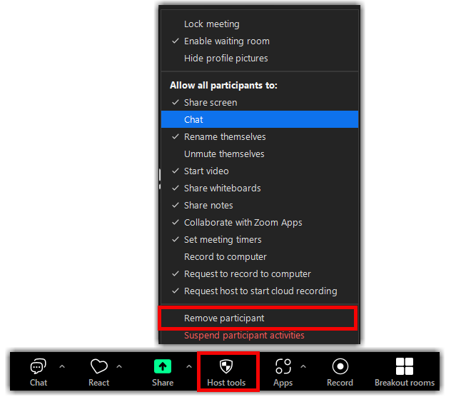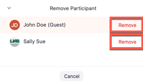 Note: Users removed from a meeting CANNOT rejoin that same meeting or future meetings with the same meeting ID. If you are wanting to remove someone that is not a threat, you can choose to move them into the waiting room instead.