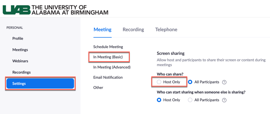 Set account to not allow meeting participants to share their screen by default for all future meetings