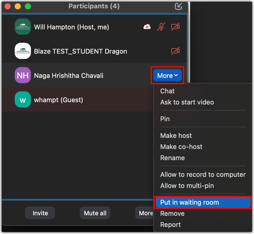 - Click More next to the participant's name and choose Put in Waiting Room.