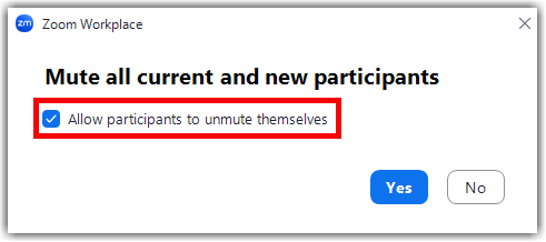 - If you want to remove the ability for participants to unmute themselves, uncheck the box. Click Yes to apply this setting.