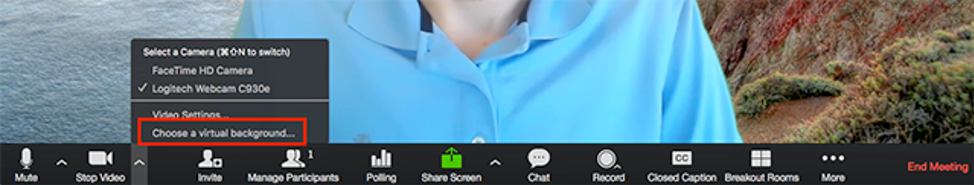 - In a Zoom meeting click the ^ arrow next to Start/Stop Video.