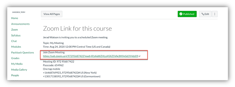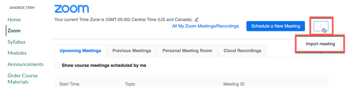 If you scheduled a meeting outside of Canvas, you can either share the meeting link in a Canvas announcement module or import that meeting into Zoom tab in Canvas.